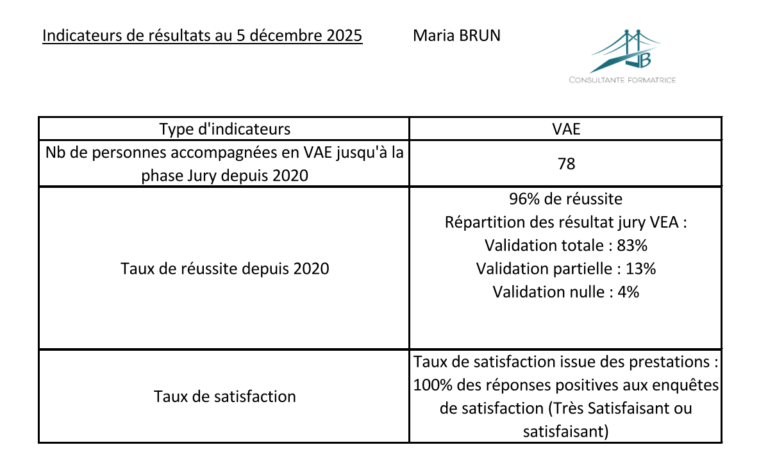 Les atouts de votre consultante : Une expérience personnelle et professionnelle de la globalité de la démarche VAE en tant que candidate, membre du jury, certifiée Formatrice Pour Adulte et experte en accompagnement VAE (Logistique, Sanitaire et Social, Tertiaire, …).